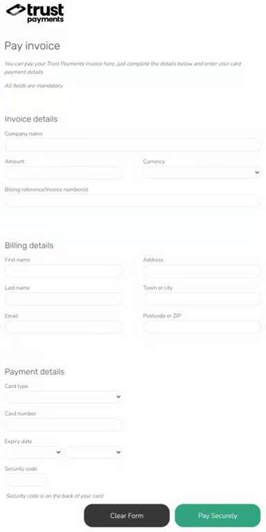 To pay an outstanding invoice, fill in all of the fields shown in the form, including your company name, amount and unique billing reference / invoice number. Once you have completed this, select "Pay Securely".