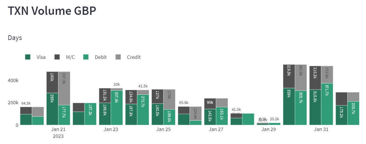 - Days - This bar chart shows the daily transaction volume for each day for the past 2 weeks in GBP. These are broken down by payments made using Visa and Mastercard schemes and also by debit and credit card transactions.