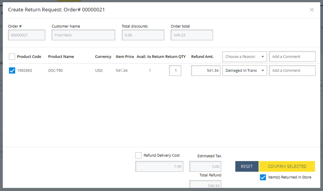 You will be prompted to create a return request, where you will need to specify the refund amount and choose whether or not to return the item to stock. Once you have reviewed the information displayed on screen, select “CONFIRM SELECTED” to continue.