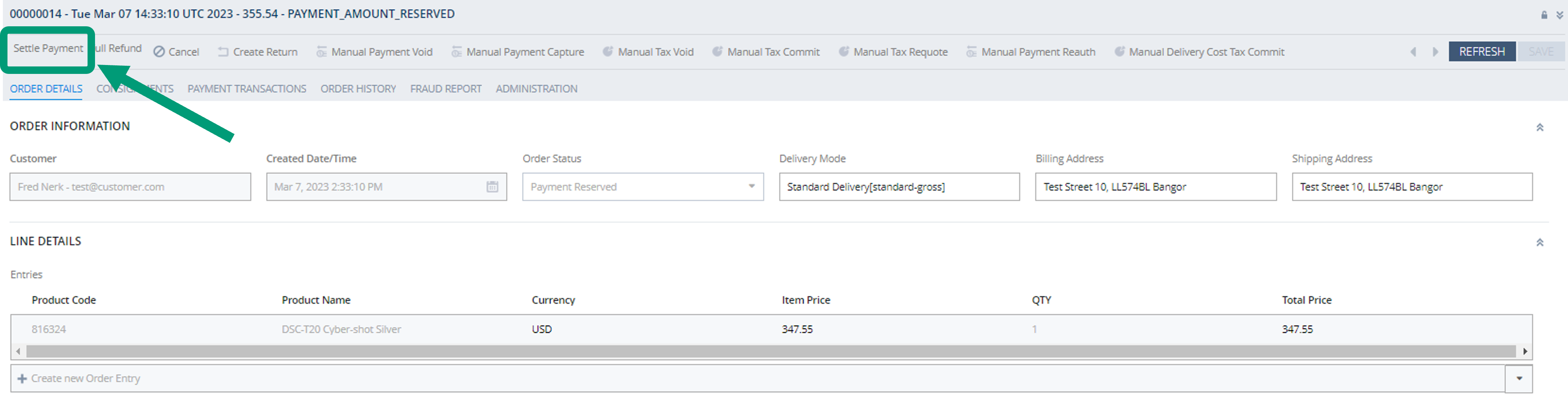 In Backoffice, navigate to Orders using the navigation on the left, and identify the order that you wish to complete. The current Status should show as “Payment Reserved”.