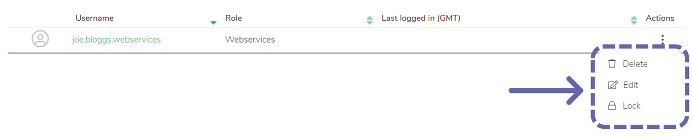 Navigate to the Manage API users page and locate the user in the table displayed (you can use the search tool to filter down this list).