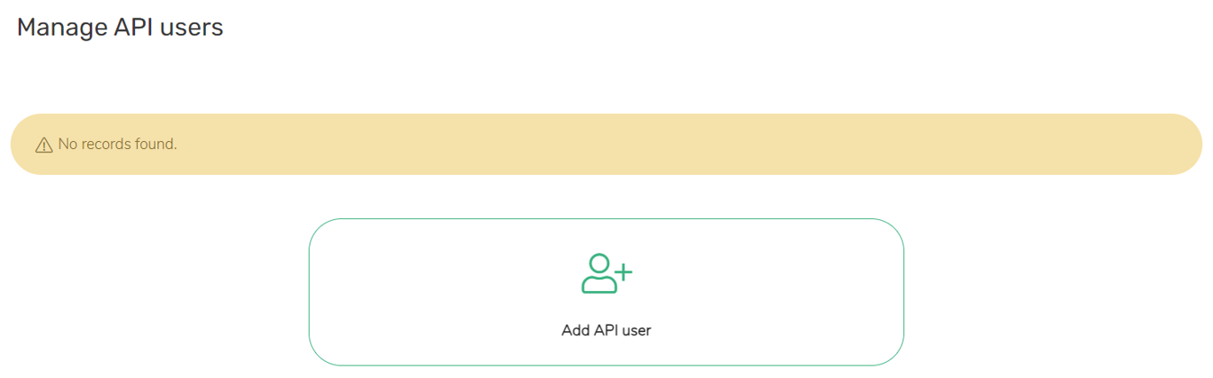 When you navigate to the API management page for the first time, you will be presented with the message "No records found". From here select "Add API user".