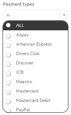 e.g. If “Payment types” “in” “American Express”, “Mastercard” and “Visa”