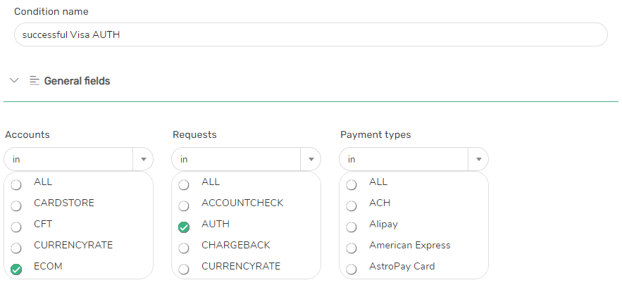 Type a unique and descriptive name into the “Condition name” text field (e.g. "successful Visa AUTH").