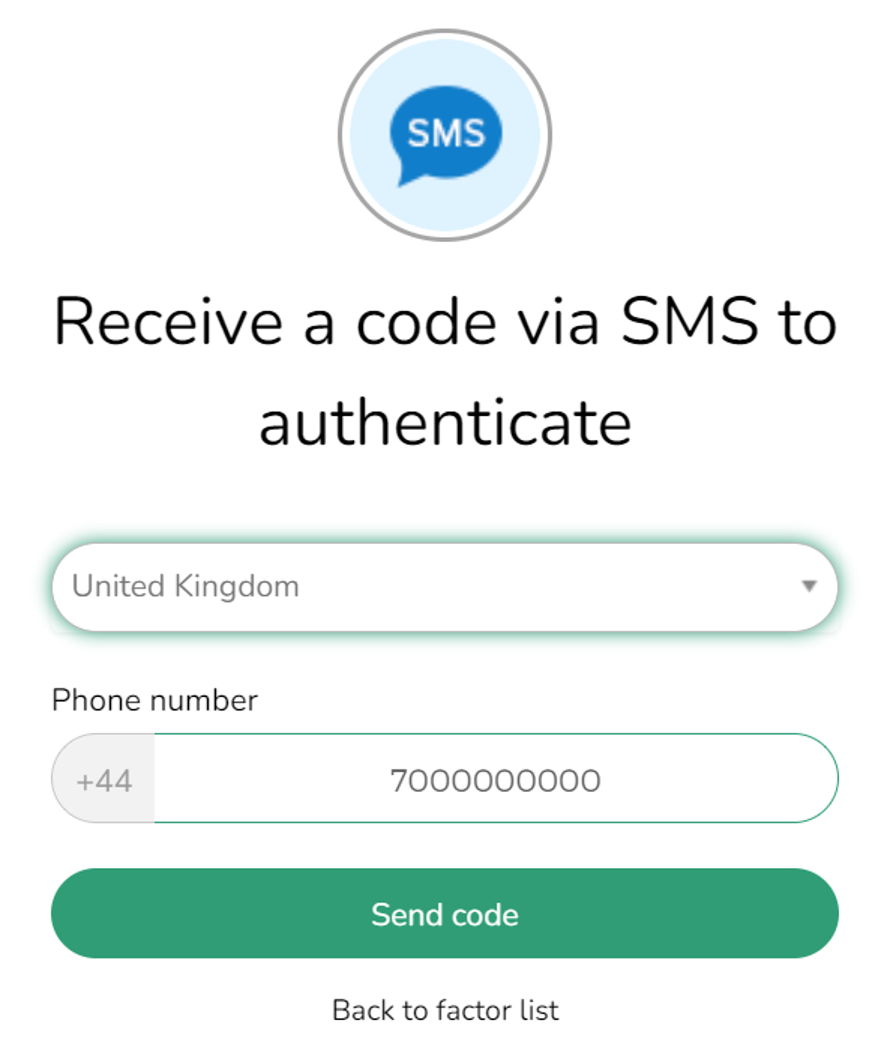 After you have selected SMS Authentication, you will be prompted to enter your mobile phone number. Enter this into the textbox provided and "Send code".