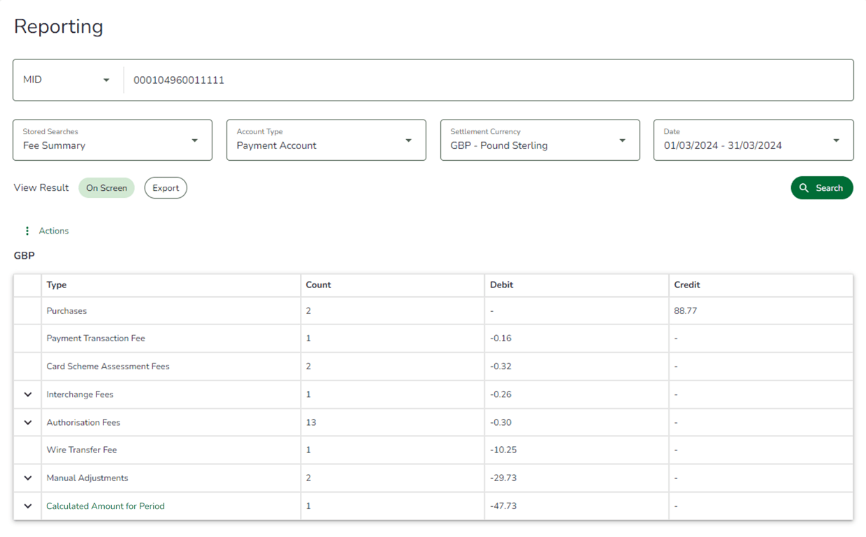 The "Fee Summary" report provides a statement-style view of the total number of transactions, fees, adjustments and other postings processed via the selected MID over a period of up to 31 days.