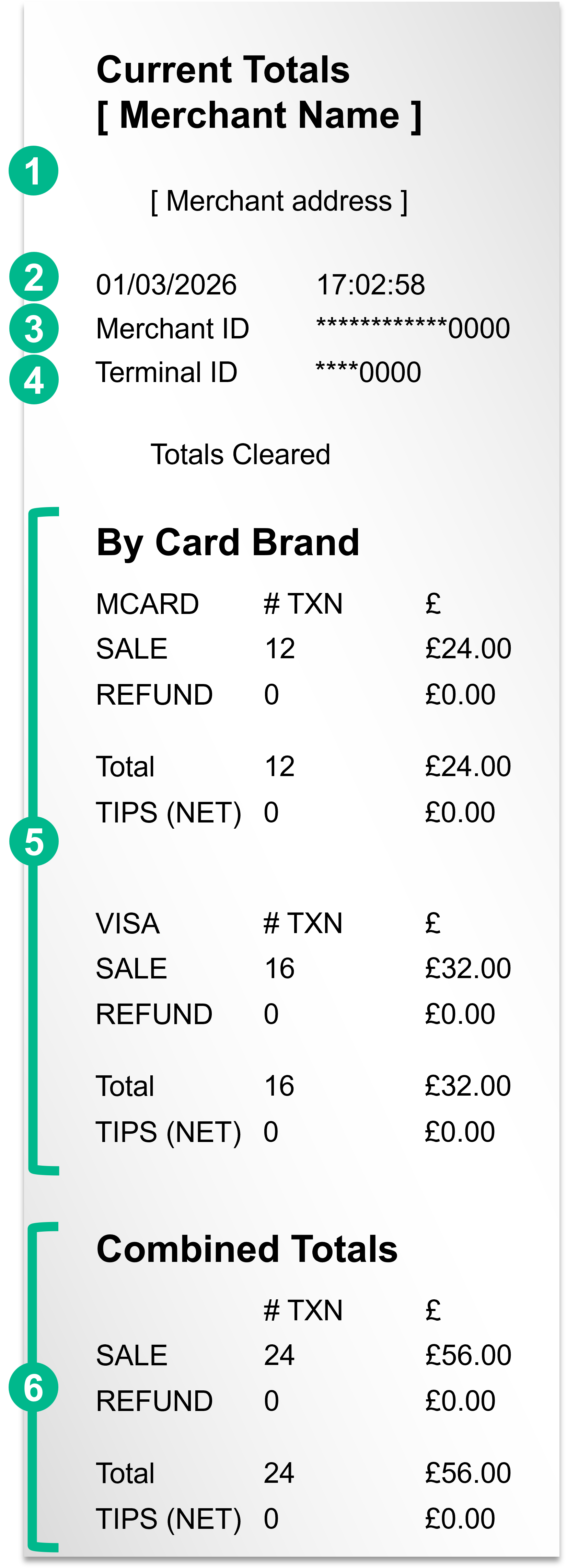 - TOTALS PER CARD BRAND - There are additional sections showing subtotals calculated from each card brand using data processed during the shift.