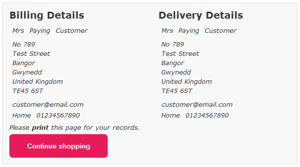 Payment Pages can be configured to show a “Continue shopping” button on the response page, following a successful authorisation request. When selected, the customer is redirected to a URL of your choosing.