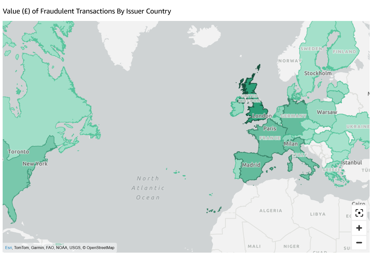- Lighter shades = lower fraudulent transaction numbers / values.