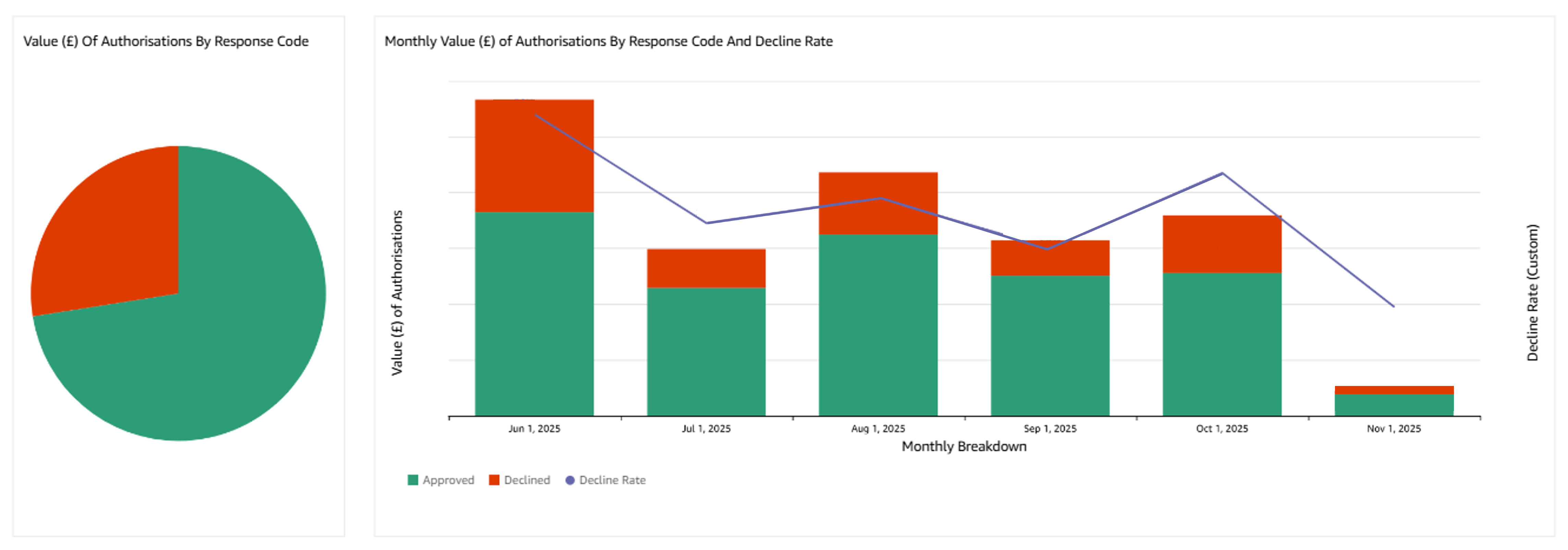 - Y Axis (Line Chart): Decline rate shown as a percentage when comparing declined authorisations to the total.