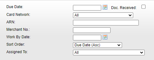 Merchant No. Filter by client number (internal merchant number) or external merchant number. Full or 4 digit Card No Filter by card number. Work By Date Filter by work by date, the date by which a case should be actioned. Limit Results Select from the "Limit Results" drop-down to limit the maximum number of cases to be returned. Sort Order Select from the "Sort Order" drop-down to specify the order in which cases are to be displayed in the results.