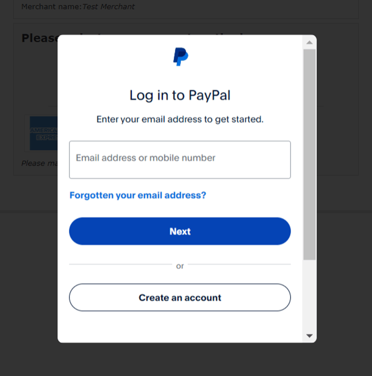 When performing test transactions, you will be redirected to PayPal's sandbox, an environment that closely resembles the interface the customer would use to sign in to their PayPal account and authorise the payment. Follow the instructions on-screen to complete a payment, after which, you will be redirected back to the Payment Pages.