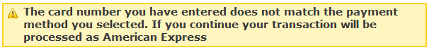 If the card details the customer has entered does not match the card type selected on the payment choice page, they are shown a yellow warning at the top of the page highlighting that the payment type has changed.