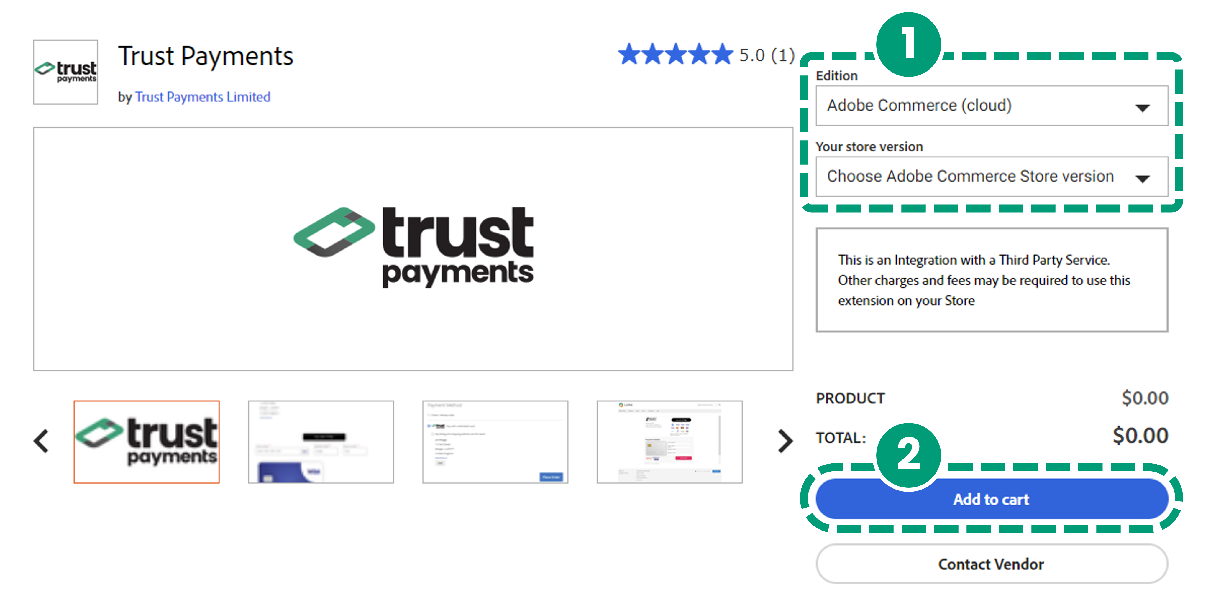 Navigate to our extension's listing in the Adobe Marketplace (link to external site), ensure you have selected the appropriate Edition and Store version from the drop-downs provided (1), then select "Add to Cart" (2).