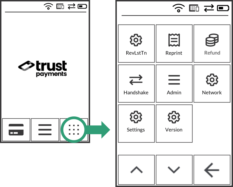 The "Quick Menu" is the home of several key terminal functions. You can access this by tapping the "Quick Menu" icon from the Main screen, as shown below.