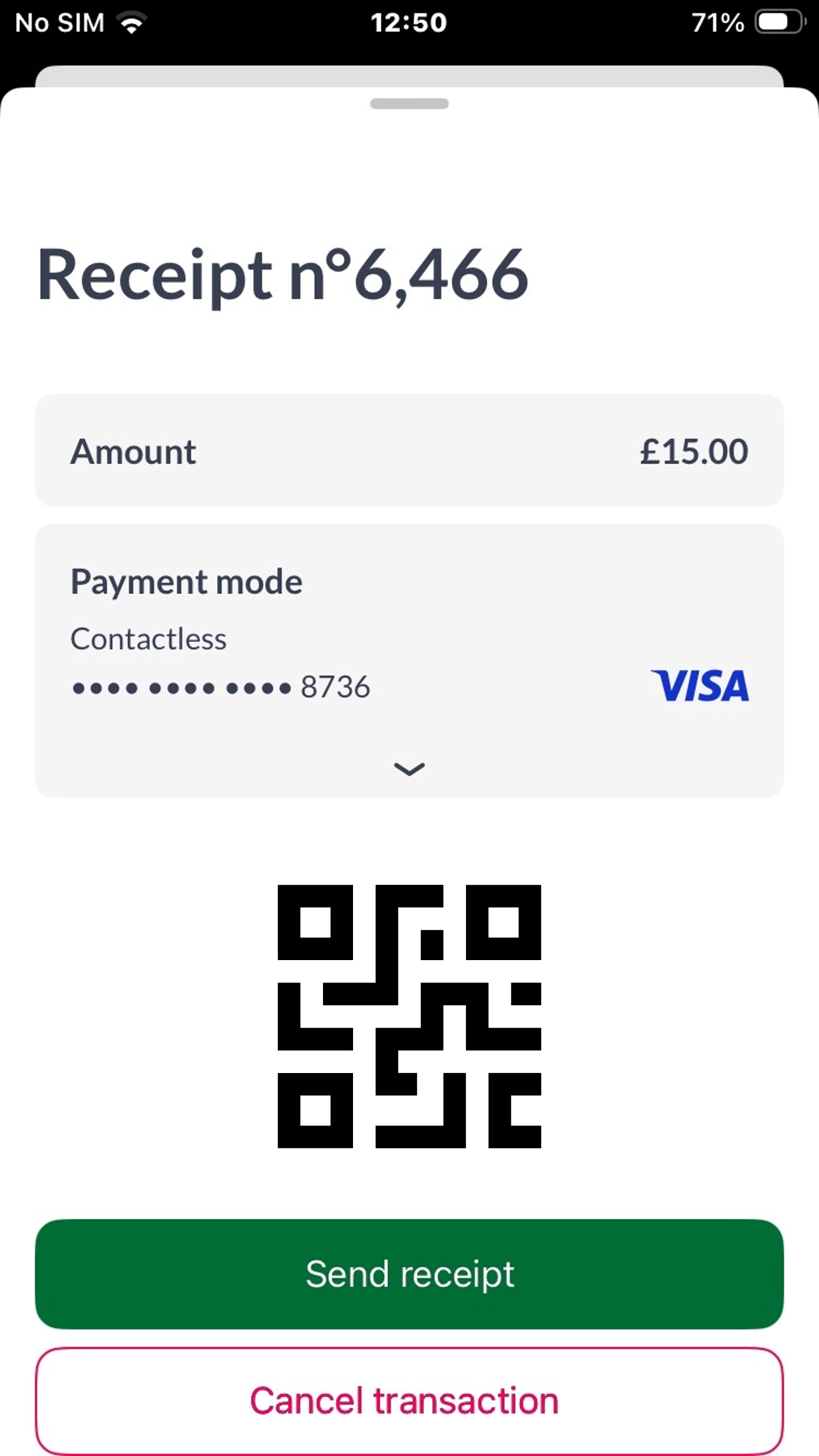 Once you have selected the transaction, you will be shown the screen below. If the customer is present, you can present the device to them so they can scan the QR code with their own smartphone. This will display the receipt on their device.