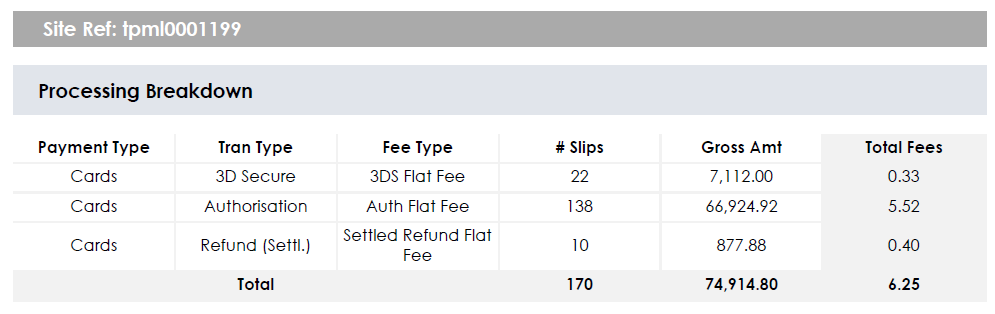 Each site reference included in the statement is provided with a Processing Breakdown, a section listing Ancillary Services & Fees and a summary of Total Fees, all of which contain information specific to the site reference listed.