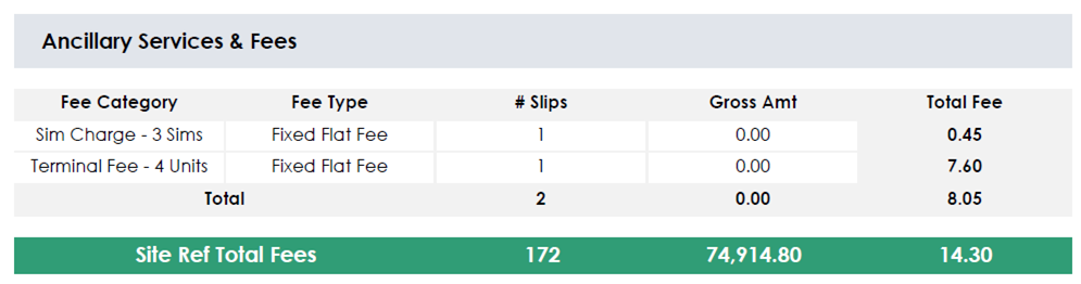 The green bar (under the Ancillary Services & Fees table) as shown below, includes the totals for the given site reference, as it aggregates both the Processing Breakdown totals and the Ancillary Services & Fees totals: