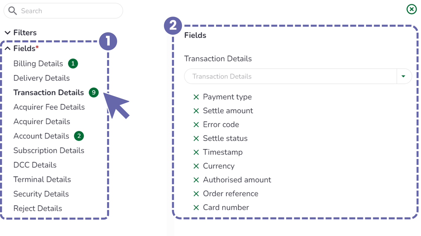 e.g. In the example below, Transaction Details is shown with "9" to indicate that 9 fields from that sub-heading will be shown as columns in the search output. Deselecting “Payment type” and “Settle amount” would remove these columns from the search results (decrementing the number shown to "7").