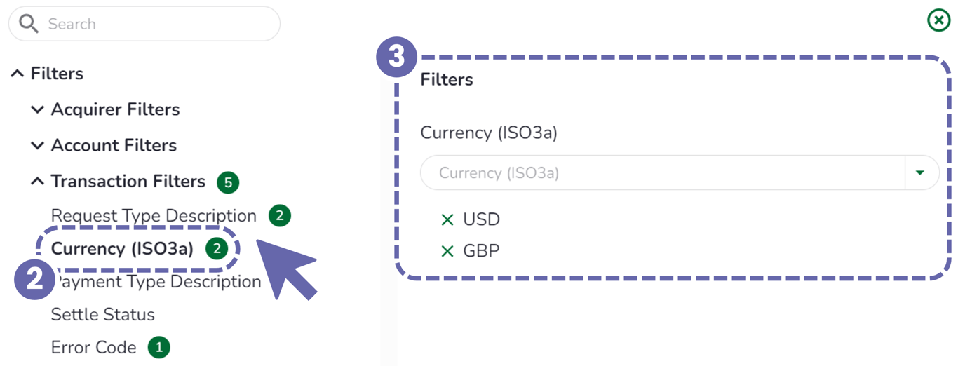 e.g. In the example below, Currency (ISO3a) is shown with "2" to indicate there are two currency filters applied from that sub-heading - in this case, "GBP" and "USD". This means that the subsequent search will only return transactions processed in those two selected currencies.