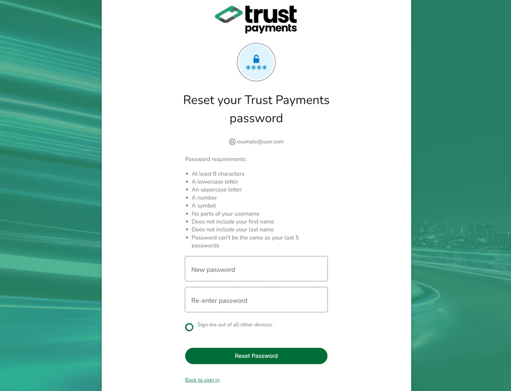You will now receive an email that provides instructions on how to reset your password. It will be sent from “no-reply@trustpayments.com” with subject “Account password reset”.